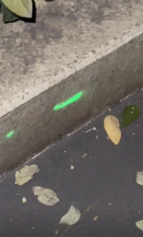 视频显示,夜间,有人打开手机上的灯光,将其贴近在一段路沿石上,随后出现了一个荧光绿的圆点。随着手机灯光的移动,路沿石的侧面也随之出现了一小段荧光绿的线条。